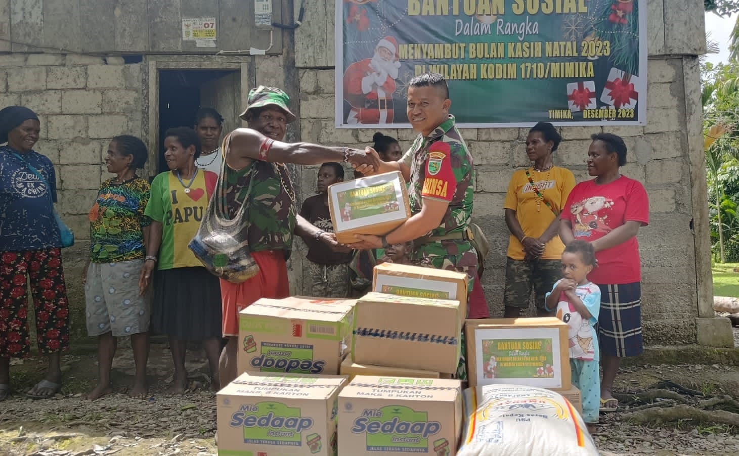 BT.COM | TIMIKA -- Dalam rangka menyambut bulan kasih Natal 25 Desember 2023, Kodim 1710/Mimika dipimpin Pasiter Kapten Infanteri Teguh Heru Ponco M. membagikan bantuan sembako kepada warga masyarakat yang tinggal di Kp. Nduga KM.11 Kadun Jaya, Distrik Wania, Kabupaten Mimika, pada Kamis 21 Desember 2023.